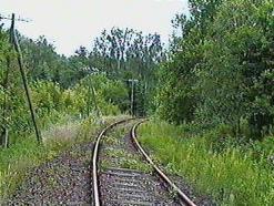 Der sehr nasse Untergrund in diesem Waldstück war einer der Gründe dafür, dass man die Streckengeschwindigkeit auf 10 km/h heruntersetzte und schließlich die Gesamteinstellung veranlasst wurde. Der Bahndamm soll hier regelrecht "geschwommen" sein.