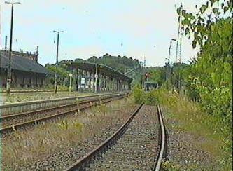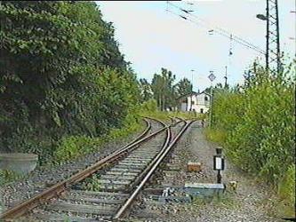 Gleich hinter dem Ausfahrsignal des Gleises 12 lag die Abzweigweiche. Die Strecke nach Rochlitz wendet sich sogleich nach links, während ein weiteres Gleis zum ehemaligen Lokschuppen verzweigte und später in das Streckengleis nach Riesa mündet.