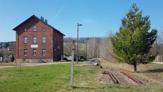 In Göritzhain befindet sich der Bahnhof etwas mehr in Ortsnähe. Am Bahngelände ist noch erkennbar, dass hier einst mehr Gleise als das Streckengleis lagen.