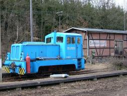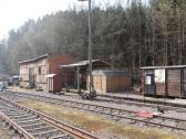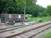 Auf dem Bahnhofsgelände treffen wir 2005 auch die Lok des "Abbauzuges" - bestehend aus Lok und Flachwagen mit Bagger - wieder. Inzwischen hat sich die Abbautruppe von Böhrigen aus bis hierher vorgearbeitet und die noch brauchbaren Gleise entfernt.