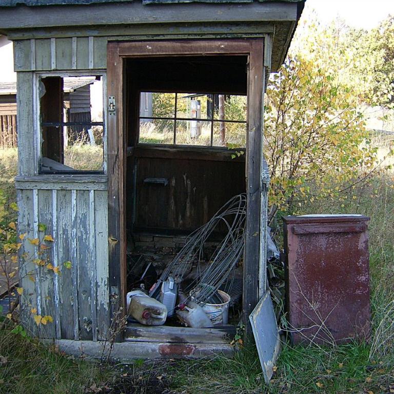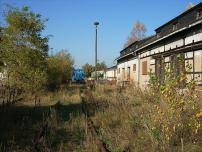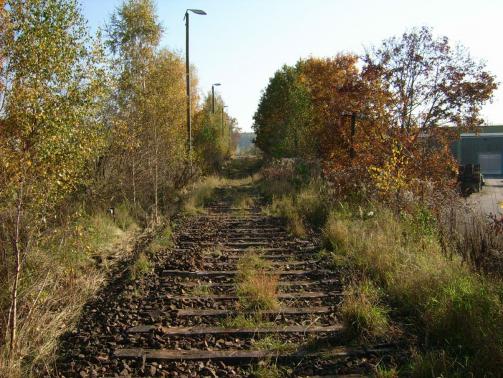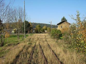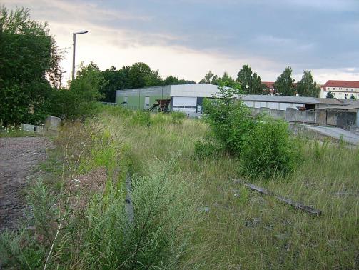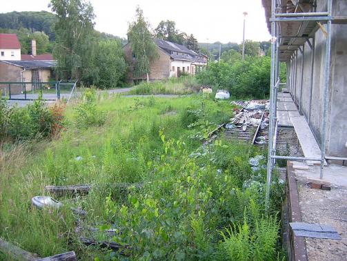 Im Bahnhofsbreich begannen die Arbeiten zum Abbau der Gleise zuerst. Deshalb waren hier zum Zeitpunkt der Aufnahmen bereits einige Schienen verschwunden. Im Bahnhof stand die Lok der Abbaufirma, mit der die Schienen zusammengezogen und dann in transportable Stücke zerschnitten wurden. 2007 sind nahezu alle Gleise verschwunden und das Unkraut verwandelt das Bahngelände in eine "blühende Landschaft".