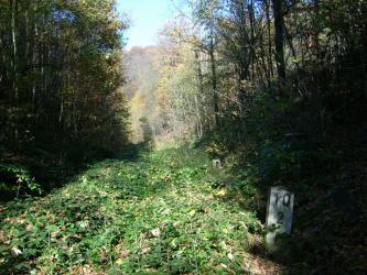 Nach Überqueren des Bahnübergangs wird das Einfahrsignal aus Richtung Berbersdorf passiert und die Strecke wendet sich auf einer Stützmauer in einem Rechtsbogen in südöstliche Richtung. Fernab jeglicher Straße geht es durch den Wald in Richtung Berbersdorf. Am Standort des ehemaligen Einfahrvorsignales hat die Natur die Strecke bereits zurück erorbert.