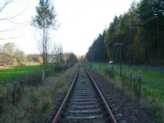 Nach einem leichten Linksbogen nähert sich die Strecke nun der Striegistalstraße und führt mit dieser einige hundert Meter parallel, vorbei an einem bewohnten Bahnwärterhaus und der Vorsignaltafel, die das Einfahrsignal für den Bahnhof Böhrigen ankündigt.
