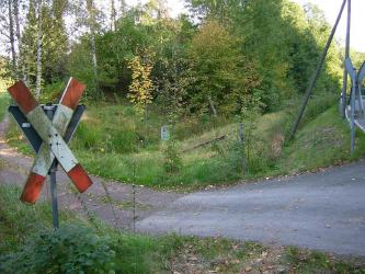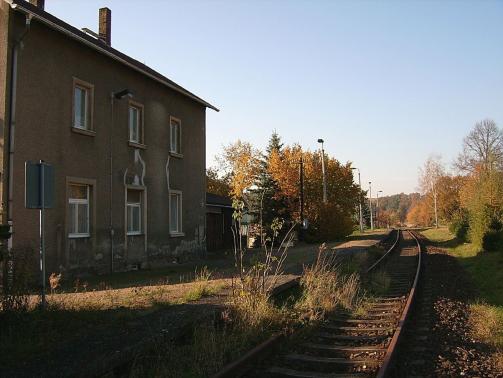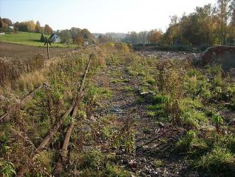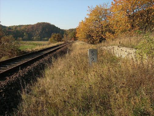 Am Kilometer 5,2 (RW) beginnt der frühere Bahnhofsbereich von Grunau. Zu erkennen ist noch die alte Verladerampe, die über einen Bahnübergang erreicht werden konnte.