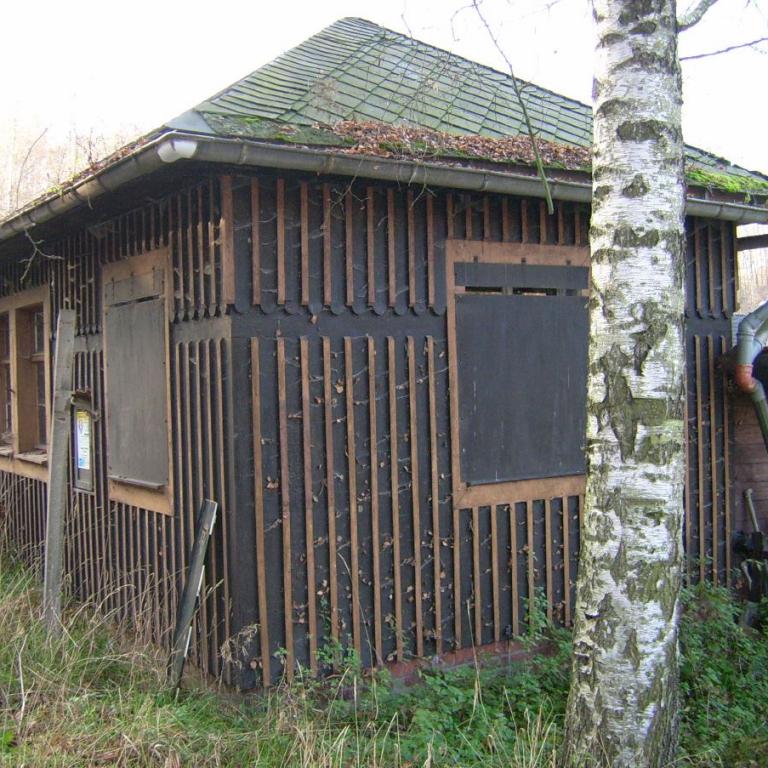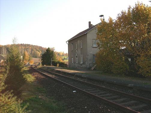 Nach wenigen Metern hielt der Zug am Bahnsteig des Haltepunktes Grunau. Das Empfangsgebäude wird seit der Umwandlung in einen unbesetzten Haltepunkt Mitte der 60er Jahre als Wohnhaus genutzt. So befinden sich Gebäude und Bahnsteig auch Jahre nach der Betriebseinstellung in einem guten Zustand.