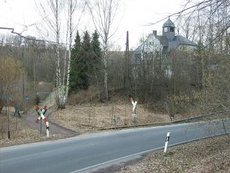 In einem leichten Linksbogen wird das Grundstück der ehemaligen Großmannschen Mühle umfahren und bald darauf der Bahnübergang an der früheren Grunauer Schule KM4,4 (RW) überquert. Dieser war bis zur Vereinfachung des Nebenbahndienstes durch drei Drahtzugschranken gesichert, die vom Bahnhof Grunau aus bedient wurden.