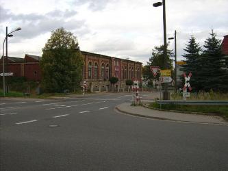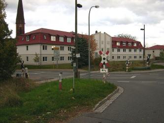 Nach einer leichten Rechtskurve wird nun der Bahnübergang an der Frankenberger Straße erreicht, der zugleich die Einfahrt in den Bahnhof Hainichen markiert.