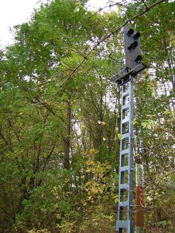 In einem weiten Linksbogen wendet sich die Strecke nun dem Bahnhof Hainichen zu. Zunächst wird die Brücke eines Wirtschaftsweges unterquert, bevor das Einfahrsignal passiert wird. Seit den Umbauarbeiten im Bahnhof Hainichen 1983 stand hier ein Lichtsignal. 2005 war es noch im Gestrüpp zu finden, 2007 liegt es nach dem Streckenrückbau im Gras.