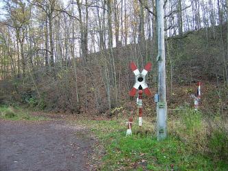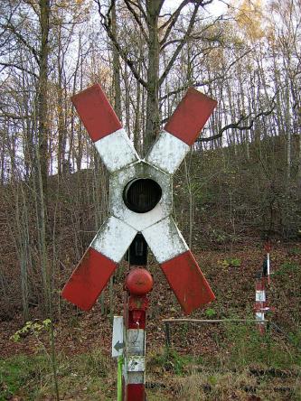 Nach der engen Rechtskurve am Trompeterfelsen taucht vor uns das Überwachungsignal auf, welches dem Lokführer mitteilte, dass die Blinklichter am Übergang Kratzmühle ordnungsgemäß per Gleiskontakt eingeschaltet wurden.