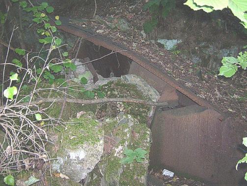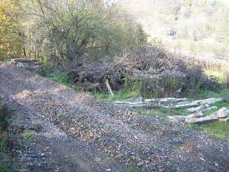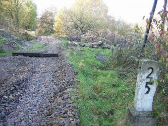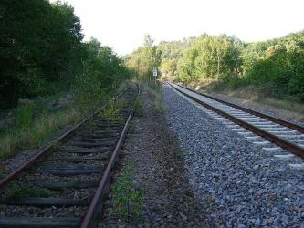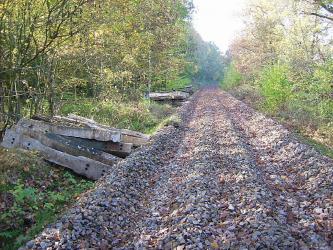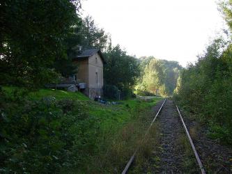 Hier befand sich einst ein Anschlussgleis zum ehemaligen Steinbruch, an dessen Anschlussweiche noch die Reste eines alten Güterwagens zu finden sind.