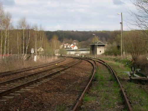 Blick Richtung Roßwein. Rechts das Stellwerk1, davor wurde das durchgehende Streckengleis ebenfalls mit einem Prellbock unterbrochen.