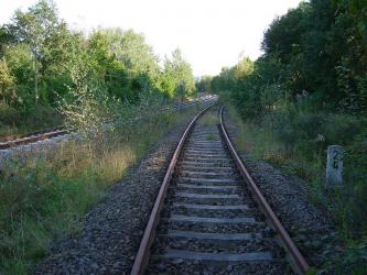 Diese Straße führte einst über den jetzigen Bahndamm und musste mit einer engen Linkskurve verlegt werden.