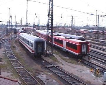 Rechts im Bild vom Gleisvorfeld des Leipziger Hbf. ist das Stellwerk B2 als weißes Gebäude zu sehen.