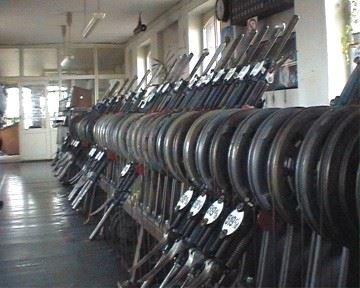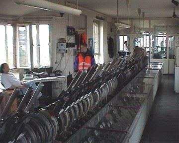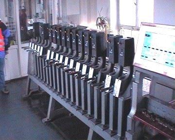 Die längste Hebelbank des "Sachsenstellwerkes" - Weichenhebel in Grundstellung nach unten. Diese gehört zum Wärterstellwerk W21, welches vom Fdl-Bereich durch eine Glaswand getrennt ist.