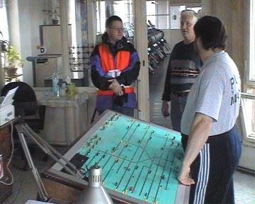 Der Fachmann aller Stellwerke -Herr Herrmann- (Mitte) im Gespräch mit dem Fahrdienstleiter am Stelltisch.