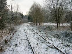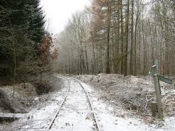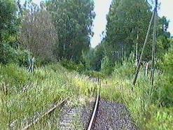 Der sehr nasse Untergrund in diesem Waldstück war einer der Gründe dafür, dass man die Streckengeschwindigkeit auf 10 km/h heruntersetzte und schließlich die Gesamteinstellung veranlasst wurde. Der Bahndamm soll hier regelrecht "geschwommen" sein.