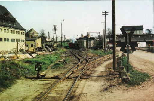 Am östlichen Bahnhofskopf zweigte das Streckengleis nach rechts ab (die vordere Weiche steht auf "Ausfahrt") während die Bahnhofsgleise geradeaus weiter zum Lokschuppen führten.
