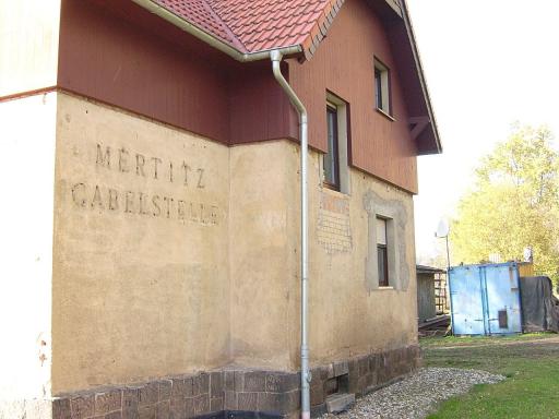 Am Bahnhofsgebäude ist noch heute der Schriftzug "Mertitz-Gabelstelle" zu finden. Leider hat der neue Besitzer die Buchstaben entfernt.