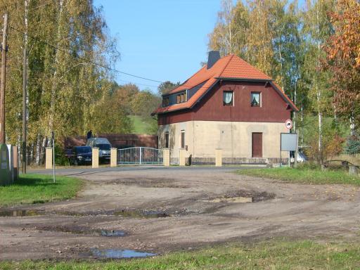 Wenige hundert Meter nach der Ausfahrt aus Mertitz-Gabelstelle querte die Straße in einer unübersichtlichen Kurve die Bahn. Hier stand früher das Einfahrtsignal, dessen Maststuhl auch heute noch im Gras zu finden ist. Allerdings nagt auch hier der Zahl der Zeit...