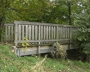 Die Bahn überquerte einst den Höllbach auf einer Blechträgerbrücke, die nach der Stilllegung der Bahn entfernt wurde.
