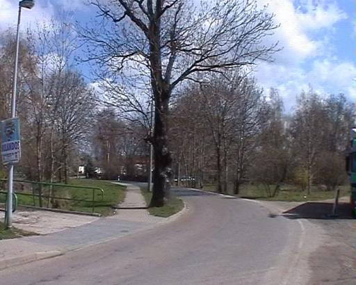 Nur wenige Meter waren es nun noch bis zur Haltestelle Gadewitz, die mit einem beidseitig angebundenen Ladegleis versehen war. Heute sind hier kaum noch Spuren zu finden, das Gelände ist eingeebnet und begrünt. Lediglich ein alter Baum teilt noch heute Straße und Weg und markiert den ehemaligen Streckenverlauf |