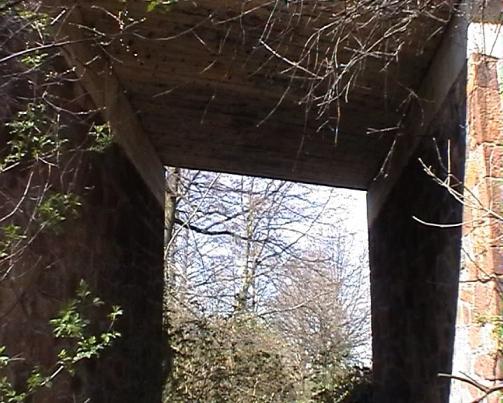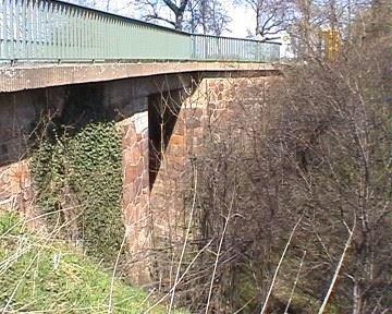 Das Brückenbauwerk aus Bruchsteinen steht noch stabil in der Landschaft.