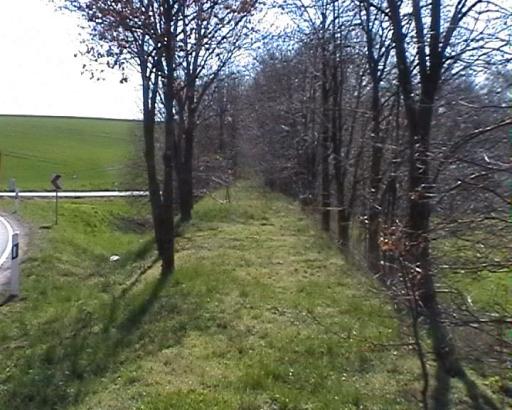An der Stelle, wo die Straße nach Schrebitz von der Hauptstraße abzweigt, ist der Bahndamm gut erhalten. Wer genau hinsieht, erkennt hier auch die nun beginnende starke Steigung hinauf nach Schrebitz-Nord.