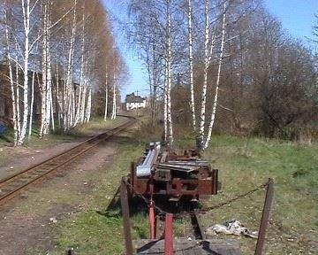 | Der Verlauf des Bahndammes ist noch gut erkennbar, auch wenn inzwischen Büsche und Bäume das Areal erobern. (Stand 2002) | An dieser Stelle befand sich früher das Einfahrtsignal aus Döbelner Richtung. Der Gittermast stand noch lange Jahre ungenutzt in der Gegend. Heute ist auch das Erdloch des Signalfußes fast verfüllt. |