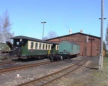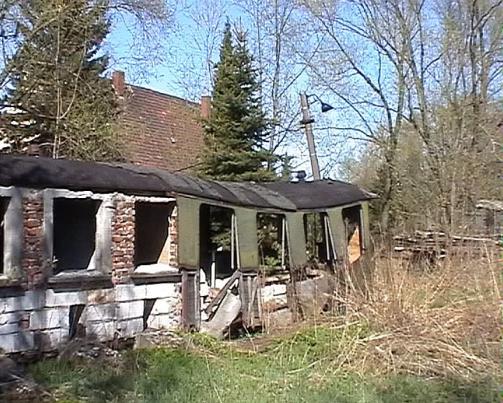 Wenige Meter weiter steht noch ein alter Personenwagen, dessen Träger inzwischen durchgebrochen sind. Zwei alte Lampen ergänzen das leider sehr verfallene Ambiente.