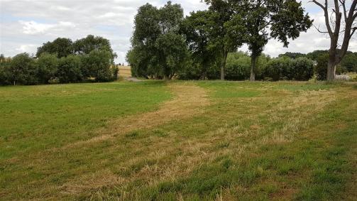 Weite Strecken des ehemaligen Bahndamms wurden in diesem Abschnitt ins Feld untergeackert. Erst hier im Tal - kurz vor dem ehemaligen Haltepunkt - wird ein kleines Stück des Bahndamms wieder sichtbar, bevor sich dieser erneut im Feld verliert.