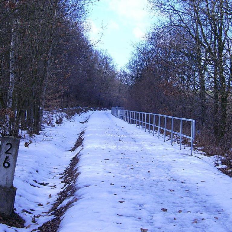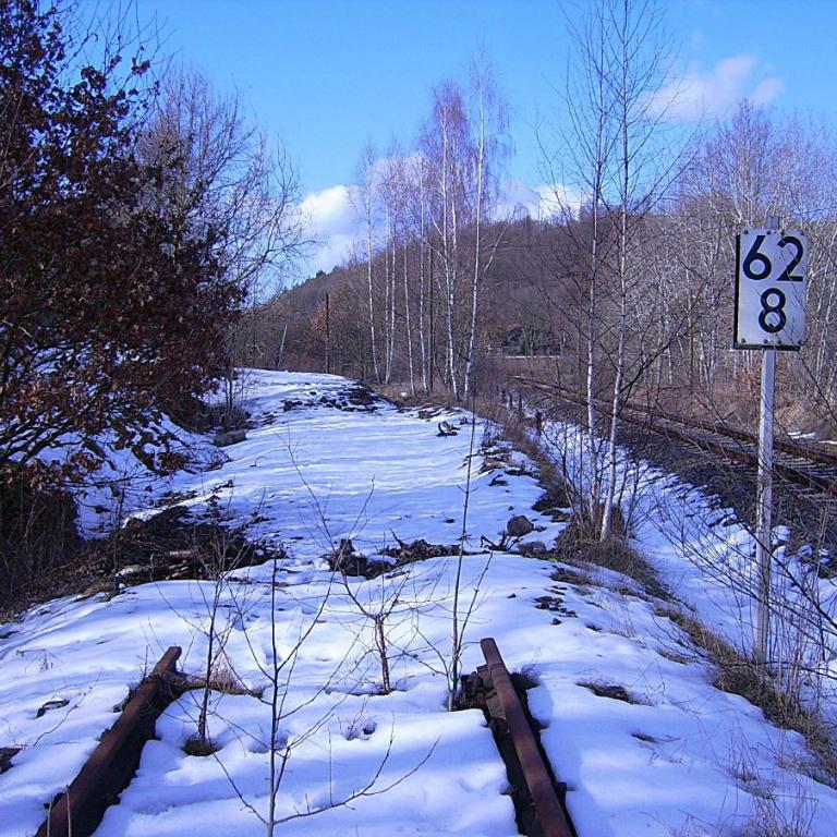 Erfreulich dabei ist, dass man beim Wegebau nicht so rigoros alle Spuren der ehemaligen Bahnlinie entfernt hat. Vielmehr erinnern noch die erhaltenen Kilometersteine und einige stehen gebliebene Telegrafenmasten daran, dass hier einst Fahrzeuge auf mehr als zwei Rädern unterwegs waren.