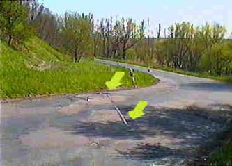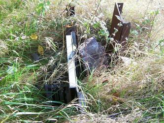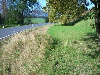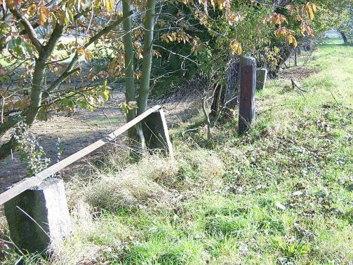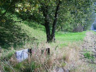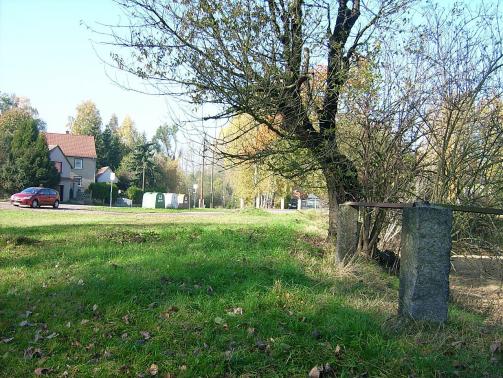 Wenige hundert Meter nach der Ausfahrt aus Mertitz-Gabelstelle querte die Straße in einer unübersichtlichen Kurve die Bahn. Hier stand früher das Einfahrtsignal, dessen Maststuhl auch heute noch im Gras zu finden ist. Allerdings nagt auch hier der Zahl der Zeit...