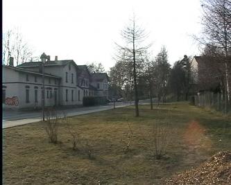 Nun stehen wir am Schmalspurbahnsteig gegenüber des Empfangsgebäudes für die inzwischen eingestellte Regelspurbahn Nossen-Riesa.
