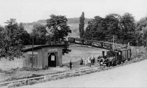 In einem engen Rechtsbogen schwenkt die Bahn nun in das Tal des Mutzschener Wassers ein. Hier lag der Haltepunkt Böhlitz-Roda.